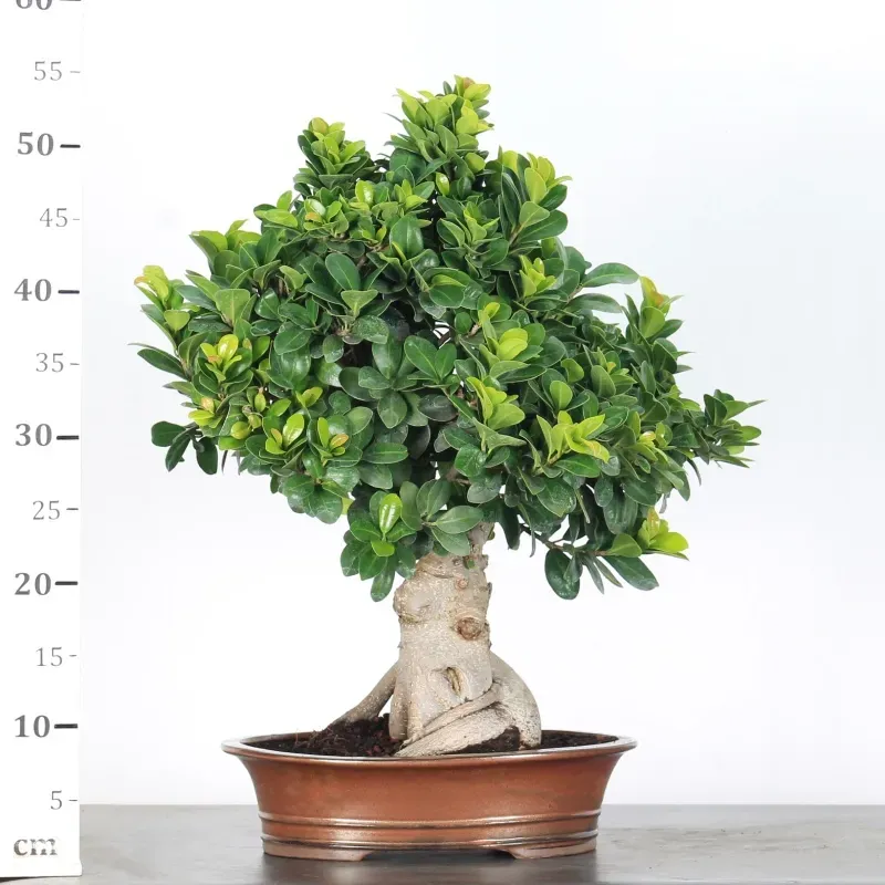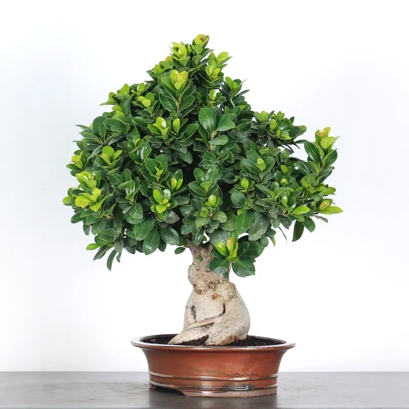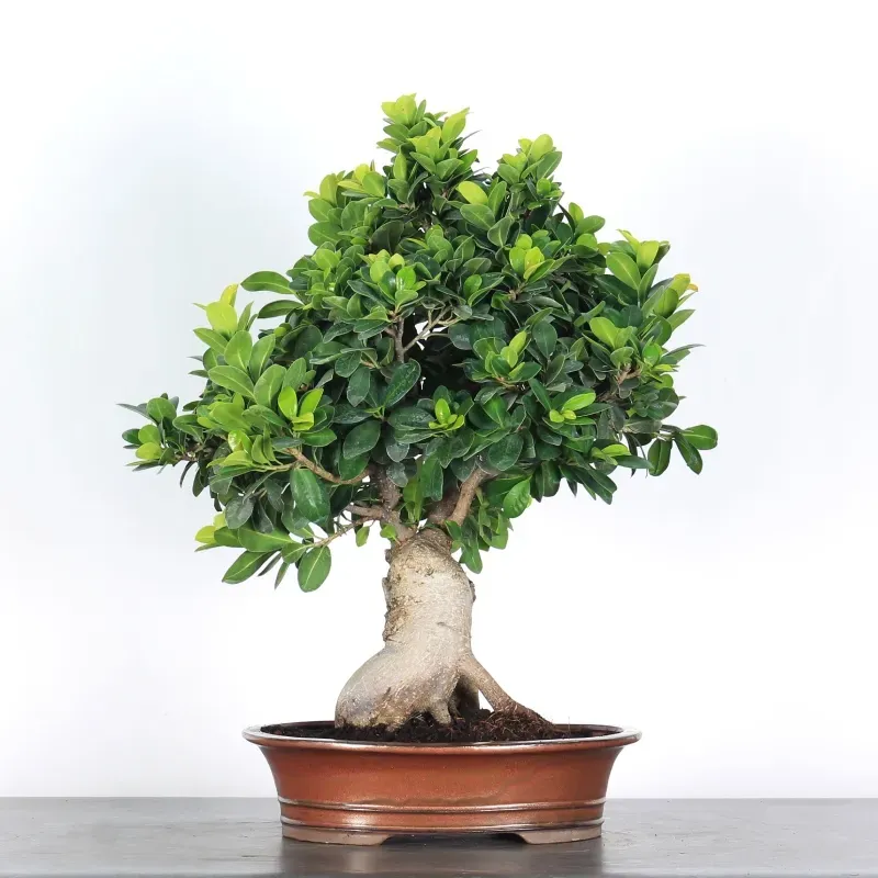 The Ficus Microcarpa “Ginseng” is instantly recognizable thanks to its thick trunk and exposed roots, giving it a sculptural, artistic appearance highly appreciated in bonsai cultivation. This robust and undemanding species adapts easily to bright indoor environments, which is why it is commonly kept as an indoor bonsai.