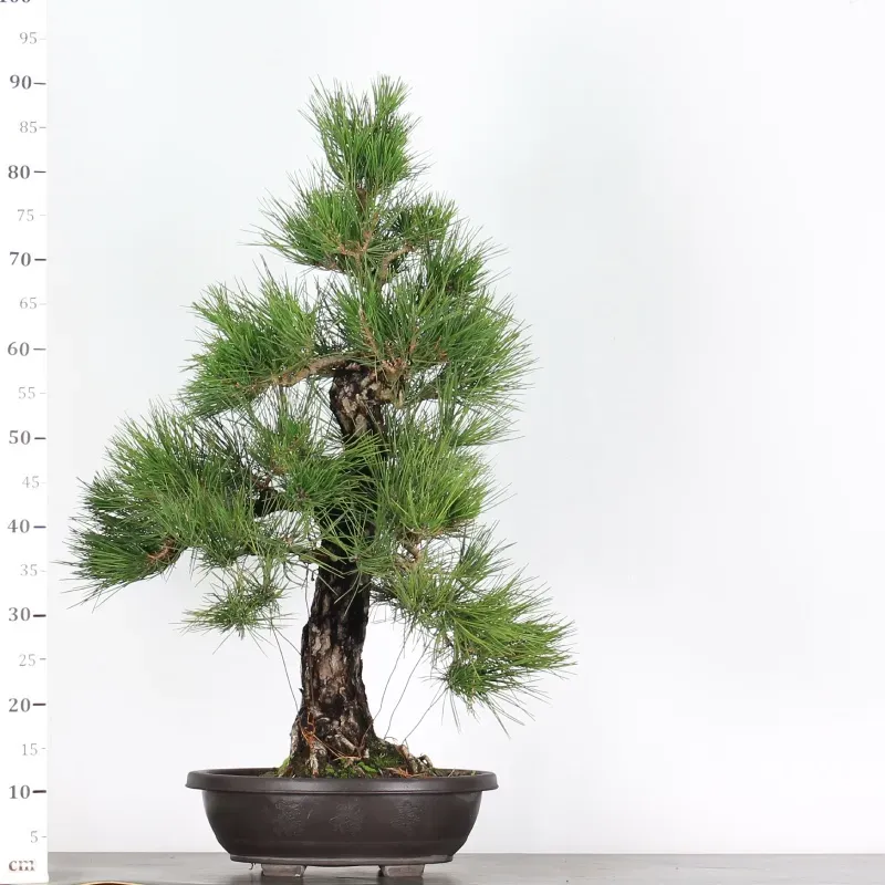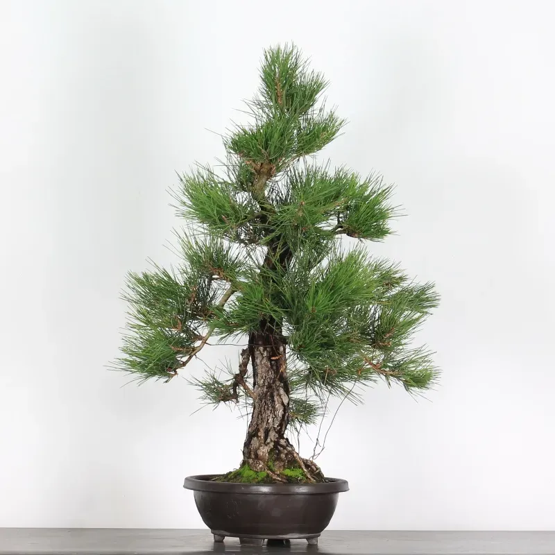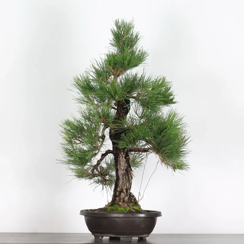 The Japanese Black Pine is a symbol of strength and virility in the bonsai world. Upright, powerful, and perfectly balanced in its pot, it rises confidently toward the sky. Its dark, cracked bark creates a striking contrast with the fresh light-green needles, giving the tree a dynamic and healthy appearance.