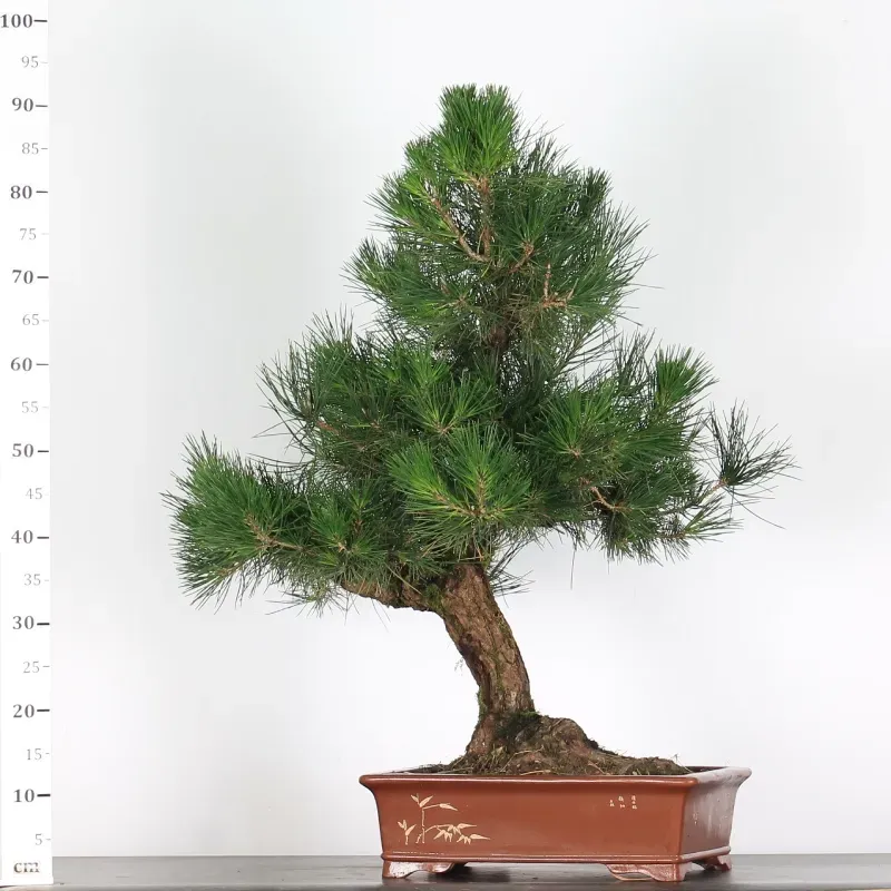 The Japanese Black Pine Bonsai is a quintessential bonsai symbol of strength and virility. Upright, magnificent, and powerful, it sits firmly in its pot and rises confidently toward the sky. Its dark, cracked bark contrasts beautifully with the fresh light-green needles, giving the tree a healthy and dynamic appearance.