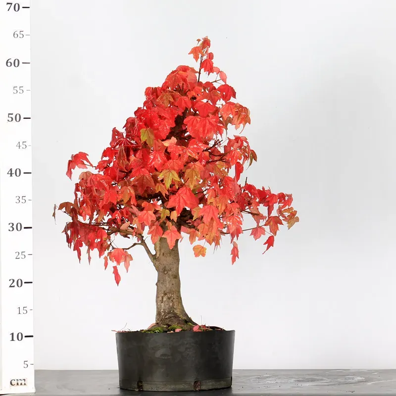 The Maple Buerger Bonsai (Acer buergerianum), also known as the Trident Maple, is a highly valued deciduous bonsai appreciated for its compact leaf size and its spectacular coloration in spring and autumn. Renowned for its vigour and rapid growth, this variety develops thick, powerful trunks that give the tree a mature and imposing presence even at a young age.